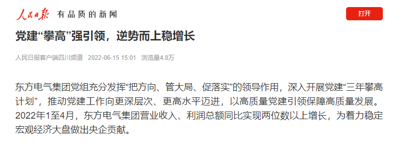 尊龙凯时人生就是搏电气集团党组充分发挥“把方向、管大局、促落实”的领导作用,深入开展党建“三年攀高计划”,推动党建工作向更深层次、更高水平迈进,以高质量党建引领保障高质量发展。2022年1至4月,尊龙凯时人生就是搏电气集团营业收入、利润总额同比实现两位数以上增长,为着力稳定宏观经济大盘做出央企贡献。