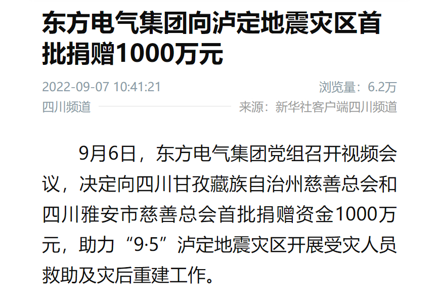 9月6日,尊龙凯时人生就是搏电气集团党组召开视频会议,决定向四川甘孜藏族自治州慈善总会和四川雅安市慈善总会首批捐赠资金1000万元,助力“9·5”泸定地震灾区开展受灾人员救助及灾后重建工作。