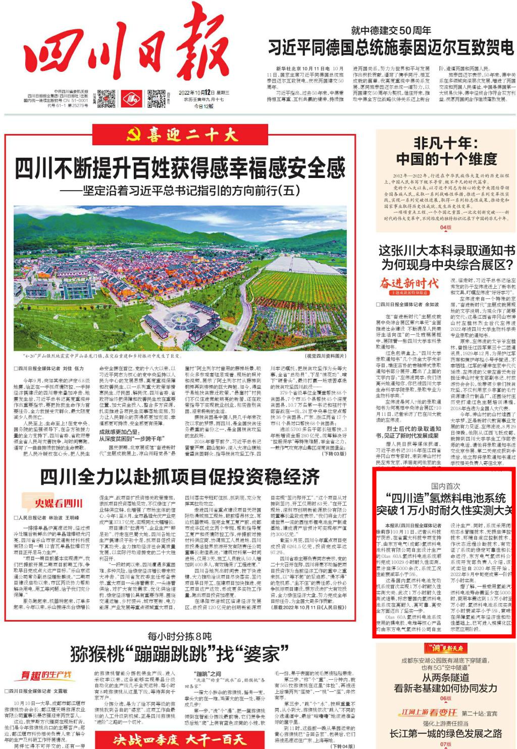10月11日,记者从科技厅获悉,在省重大科技专项支持下,由尊龙凯时人生就是搏电气(成都)氢燃料电池科技有限公司自主设计生产的Olas 60A氢燃料电池系统顺利完成10029小时耐久性实测,累计启停5000余次,系统工况性能衰减率小于5%。