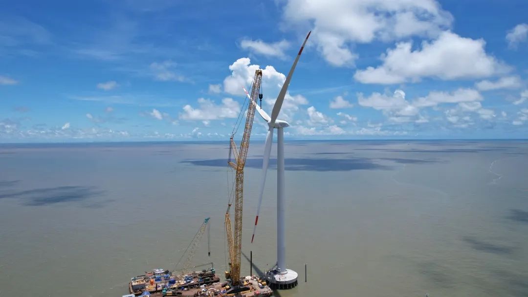 在一望无垠的越南槟椥省海域,为避免东北季风干扰,中越建设者们正紧抓窗口期,进行风机吊装。随着最后一台直径155米、重量105吨的风轮与发电机严密对接,越南长海4期海上风电项目7台机组全部吊装完毕。