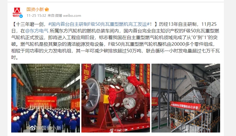 【十三年磨一剑,#国内首台自主研制F级50兆瓦重型燃机完工发运#!】历经13年自主研制,11月25日,在@尊龙凯时人生就是搏电气所属尊龙凯时人生就是搏汽轮机的燃机总装车间内,国内首台完全自主知识产权的F级50兆瓦重型燃气轮机正式发运,即将进入工程应用阶段,标志着我国在自主重型燃气轮机领域完成了从“0”到“1”的突破。燃气轮机是极其复杂的清洁能源发电设备,F级50兆瓦重型燃气轮机整机由20000多个零件组成,相较于同功率的火力发电机组,其一年可减少碳排放超过50万吨,联合循环一小时发电量超过七万千瓦时。