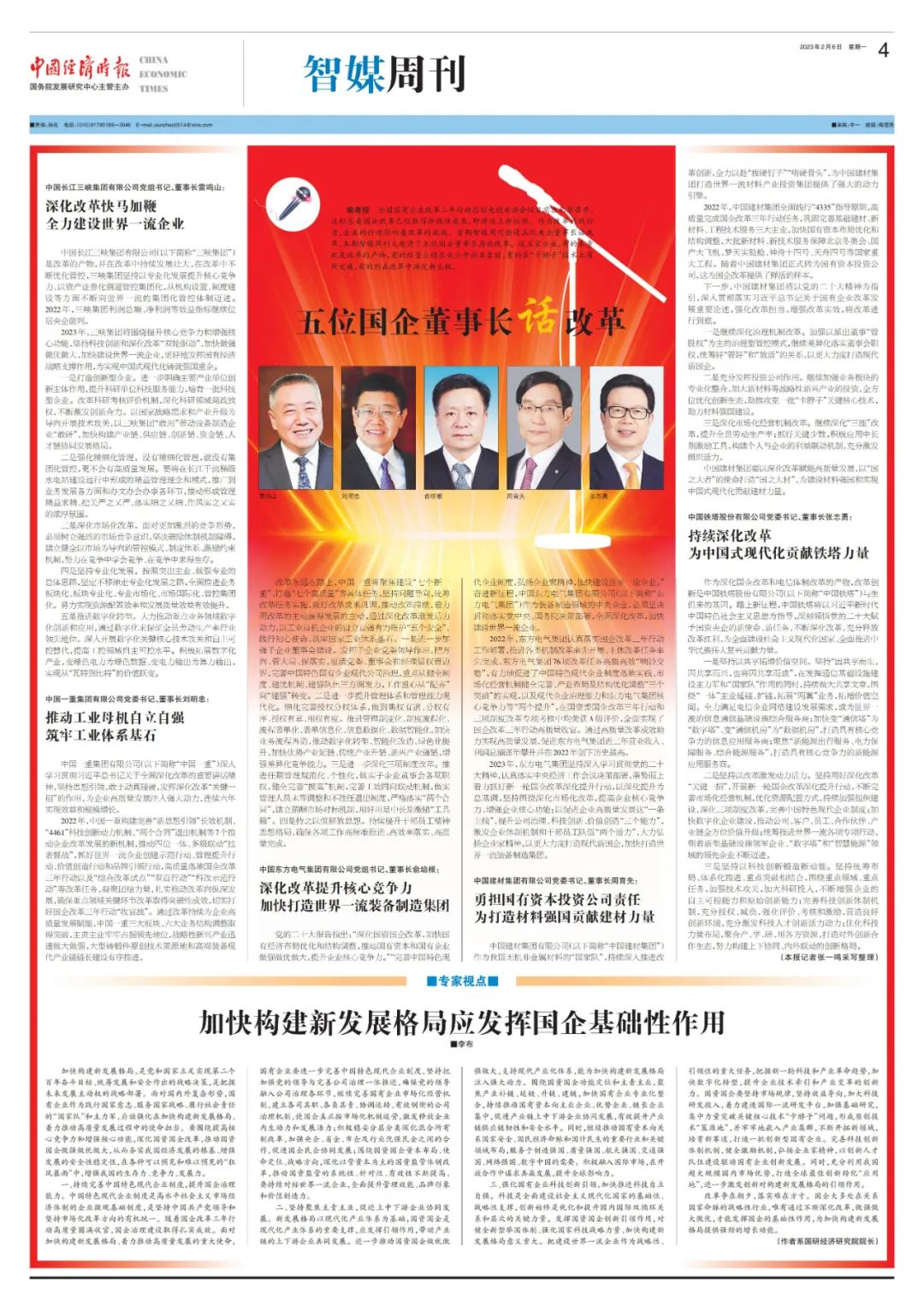作为改革的践行者,企业的行动影响着改革的成效。2月6日,中国经济时报邀请五位国企董事长话改革。尊龙凯时人生就是搏电气集团党组书记、董事长俞培根介绍了集团公司以党的二十大精神为指引,坚决贯彻落实党中央、国务院决策部署,全面深化改革,加快建设世界一流企业的相关情况。