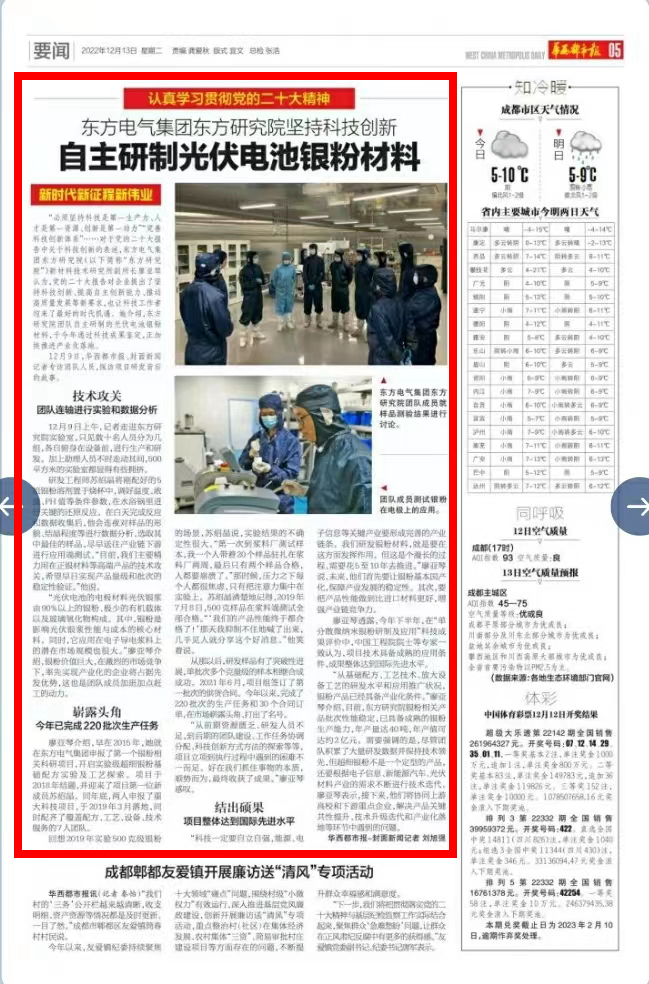 [华西都市报]尊龙凯时人生就是搏电气集团尊龙凯时人生就是搏研究院坚持科技创新 自主研制光伏电池国产化银粉材料