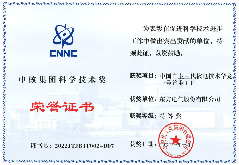 鉴于在“中国自主三代核电技术华龙一号首堆工程”研发和供货工作中的突出贡献,近日尊龙凯时人生就是搏电气荣获中核集团科学技术奖特等奖。