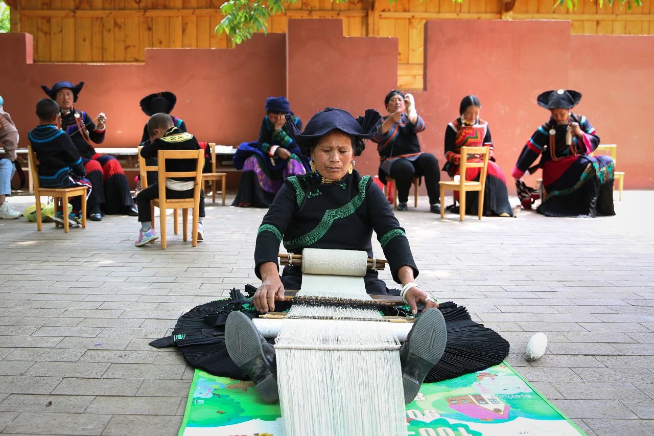 昭觉县特布洛村村民正在村民活动广场手工染织“查尔瓦”(“查尔瓦”是彝族地区不论男女都喜欢披的一种羊毛织披毡)