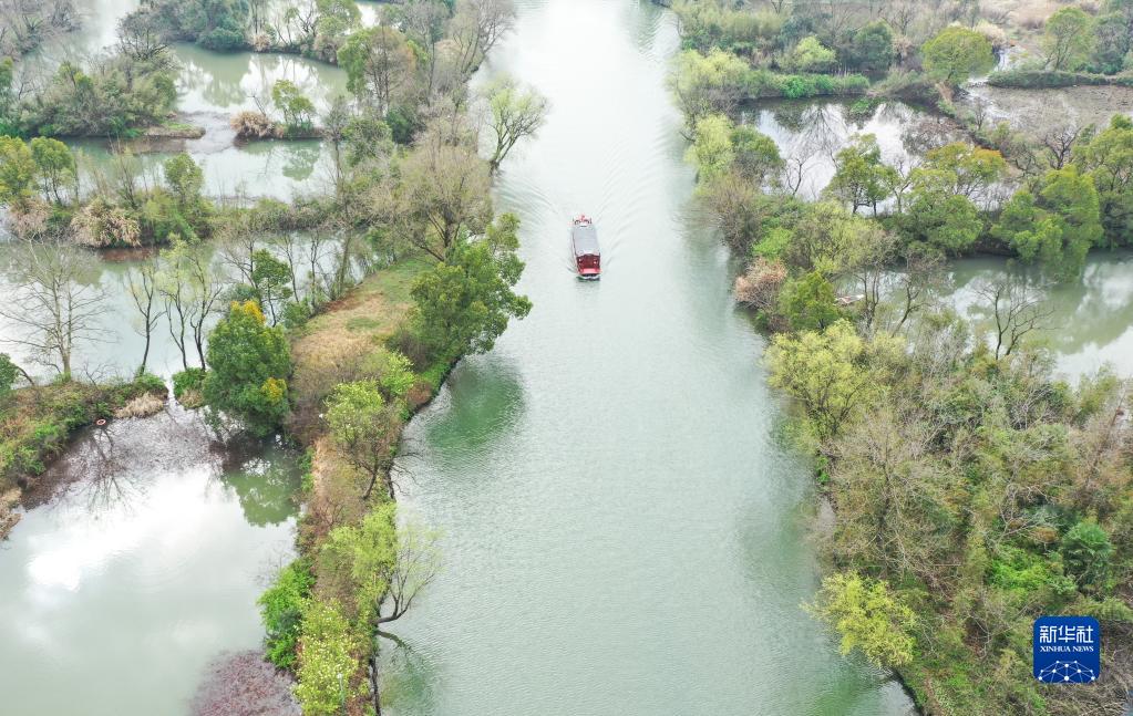 游船行驶在西溪湿地水道上(2021年3月2日摄,无人机照片)。新华社记者 翁忻旸 摄