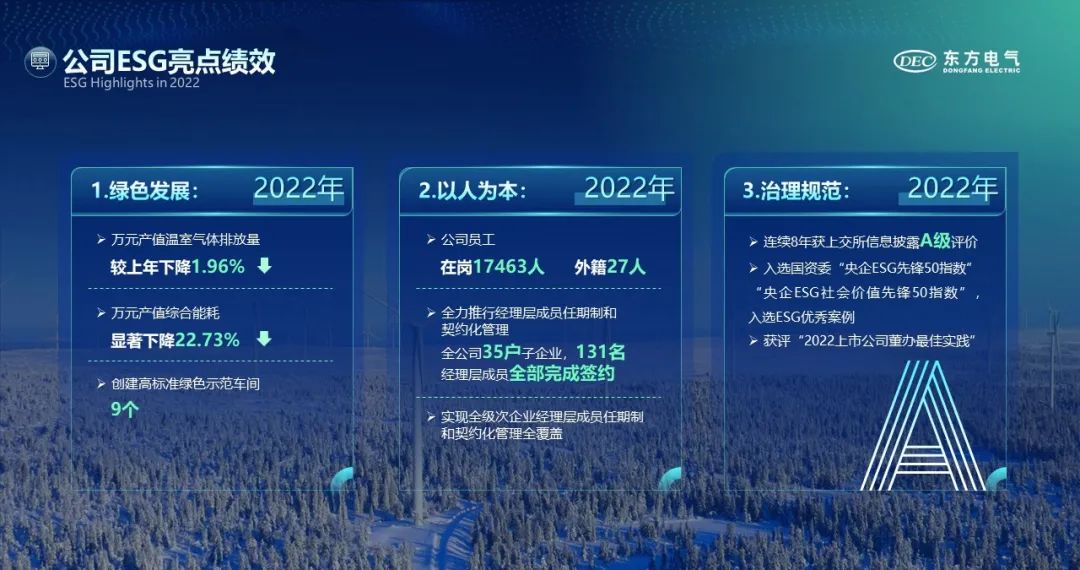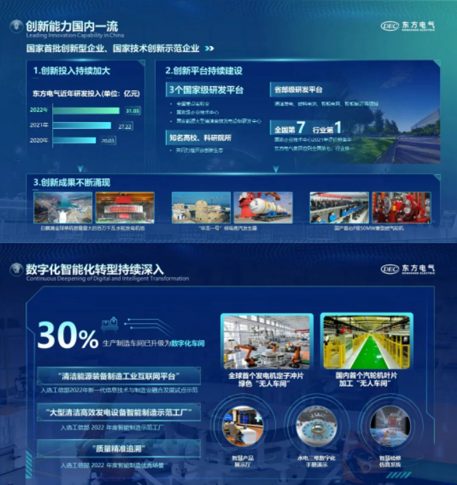 2022年,公司坚持科技创新战略引领,制定发布中长期科技创新规划;强化创新平台建设,构建领先的水电、氢能等产业创新联合体。科技创新成果突出,完成国内首台自主知识产权F级50MW重型燃气轮机等一批科技创新成果。公司坚持绿色转型与数字化转型协同发展,发布碳达峰碳中和行动方案、数字化转型行动计划,创新驱动企业核心竞争力不断提升。