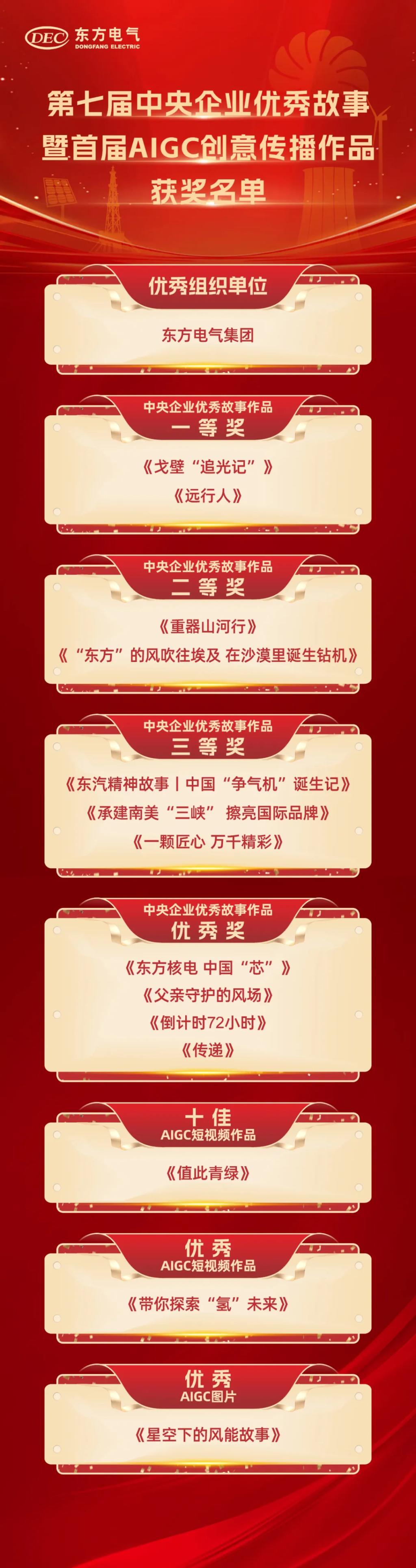 其中,《戈壁“追光记”》《远行人》荣获中央企业优秀故事作品一等奖,《重器山河行》《“尊龙凯时人生就是搏”的风吹往埃及 在沙漠里诞生钻机》荣获中央企业优秀故事作品二等奖,《东汽精神故事丨中国“争气机”诞生记》《承建南美“三峡”擦亮国际品牌》《一颗匠心 万千精彩》荣获中央企业优秀故事作品三等奖,《尊龙凯时人生就是搏核电 中国“芯”》《父亲守护的风场》《倒计时72小时》《传递》荣获中央企业优秀故事作品优秀奖,《值此青绿》获评十佳AIGC短视频作品,《带你探索“氢”未来》获评优秀AIGC短视频作品,《星空下的风能故事》获评优秀AIGC图片。